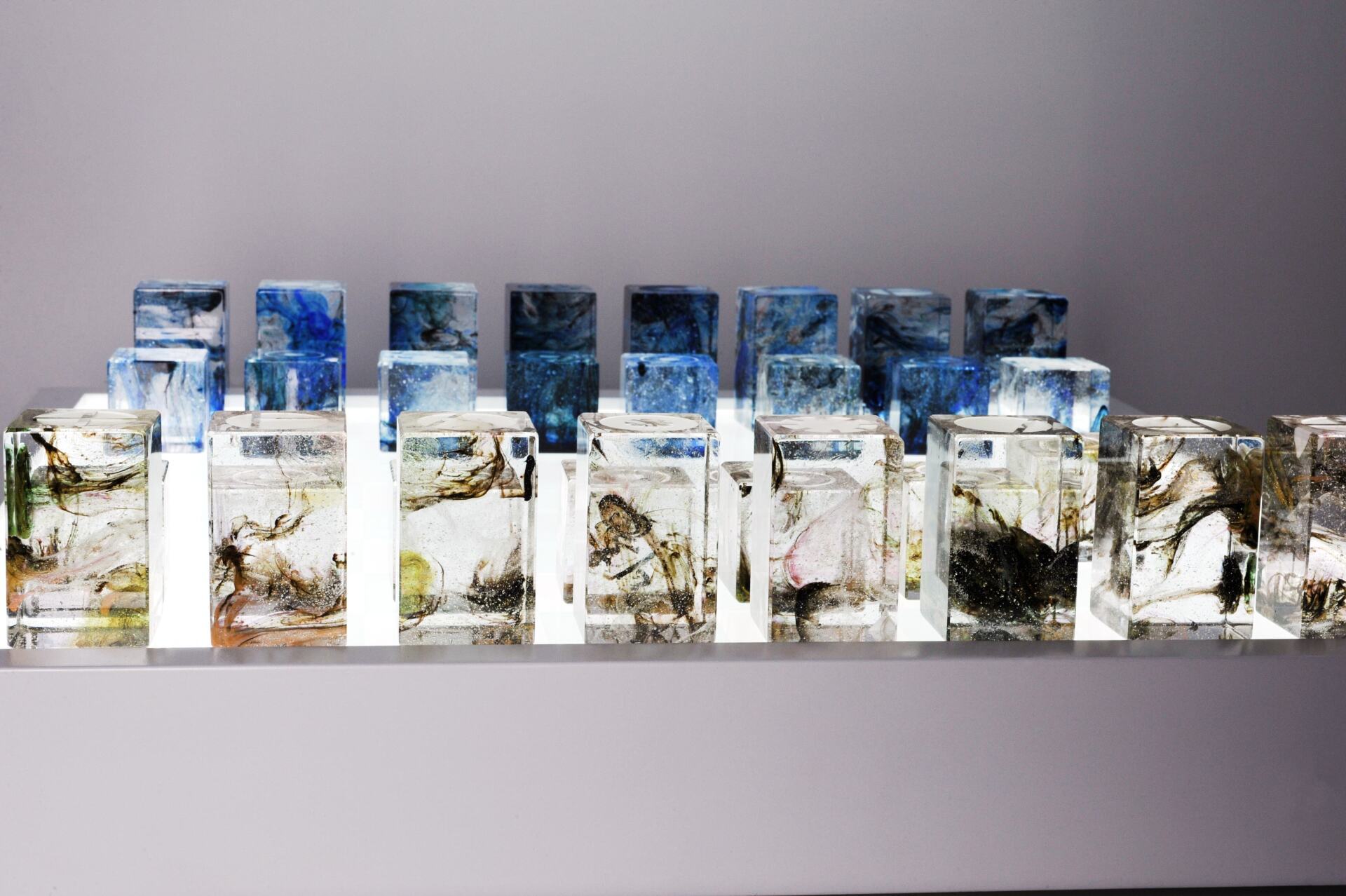 These boiled crystal blocks have wisps of elegant translucent colors .