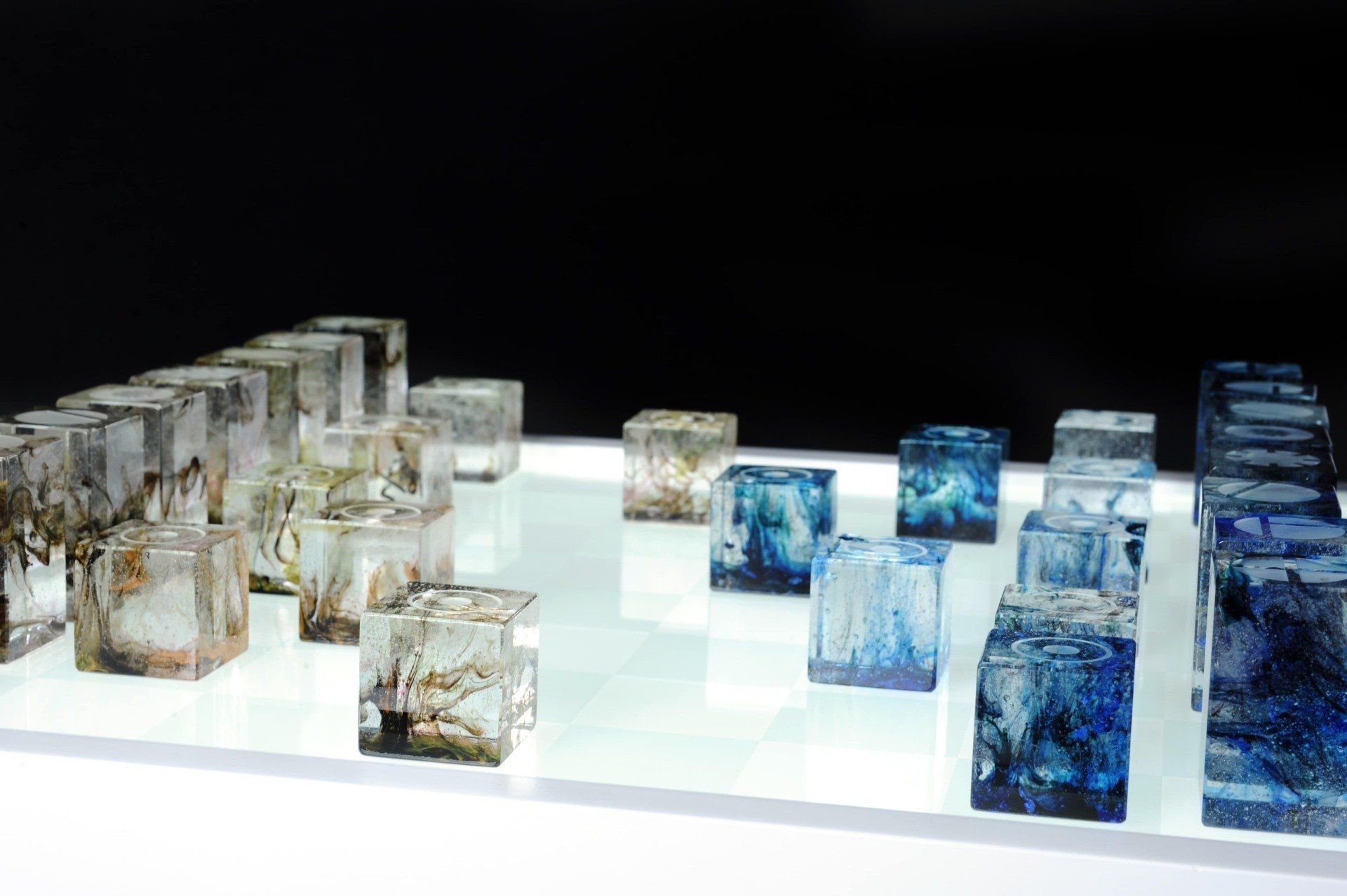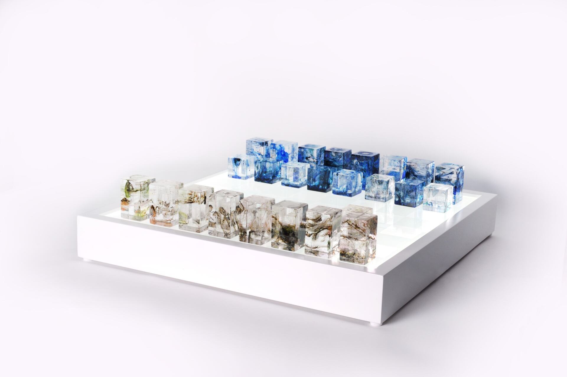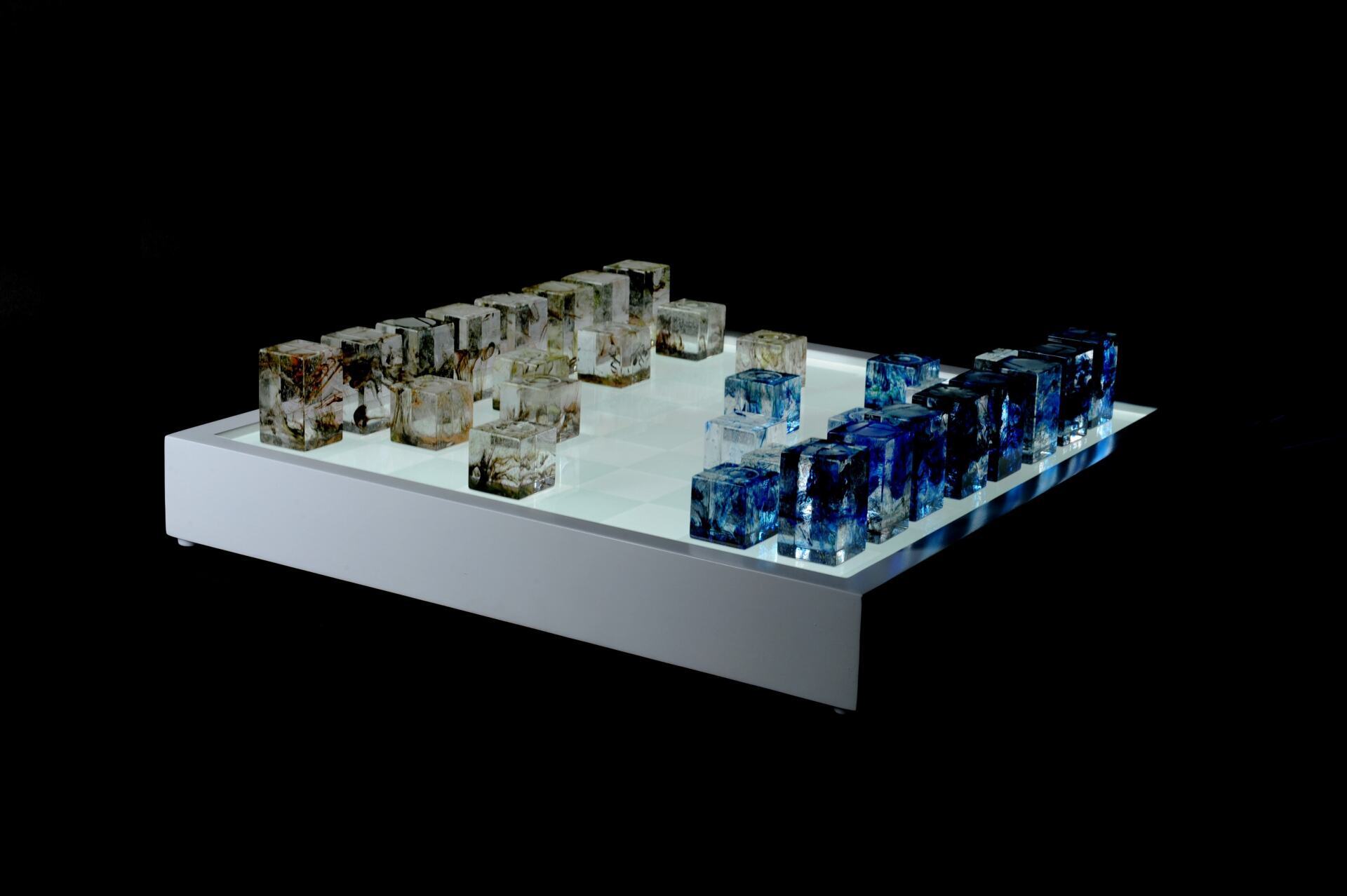 Illuminated Chess Board with Qubic Chess Pieces